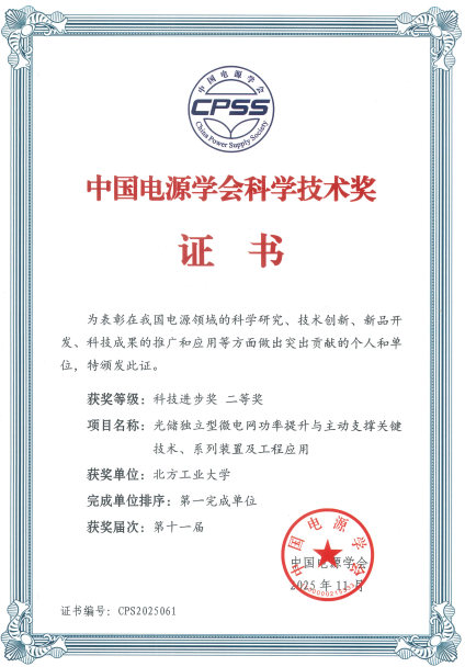 由我校作为第一完成单位,周京华教授、张卫平教授共同牵头完成的项目“光储独立型微电网功率提升与主动支撑关键技术、系列装置及工程应用”,获得“中国电源学会科技进步奖(技术开发类)”二等奖。第十一届中国电源学会科学技术奖共评选出项目类一等奖4项、二等奖13项。